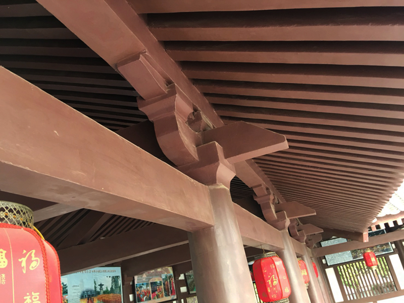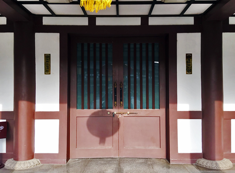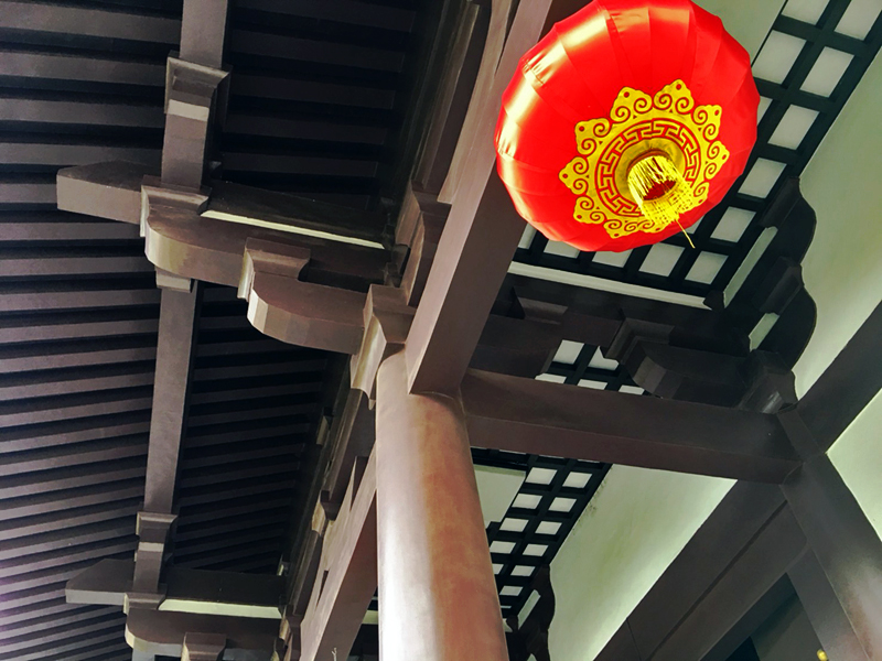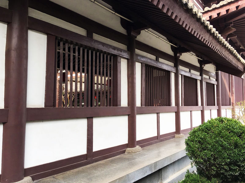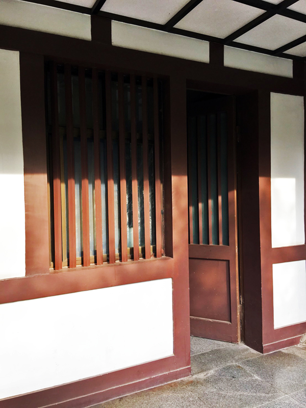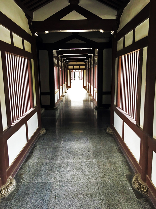 法門寺的庭園與石板門設計,從這裡一角也可以稍稍窺見寺院格局方正、有次第。亦可從左邊看見建築之斗拱、側腳設計。