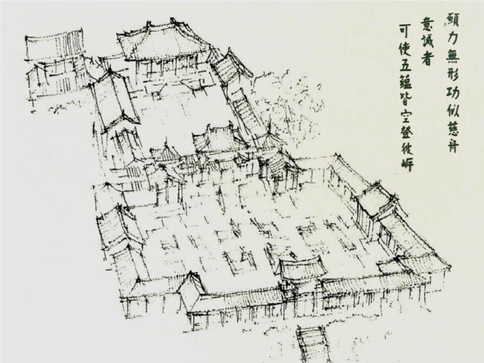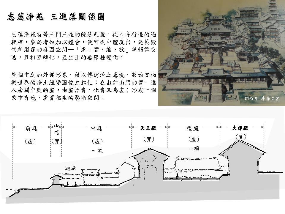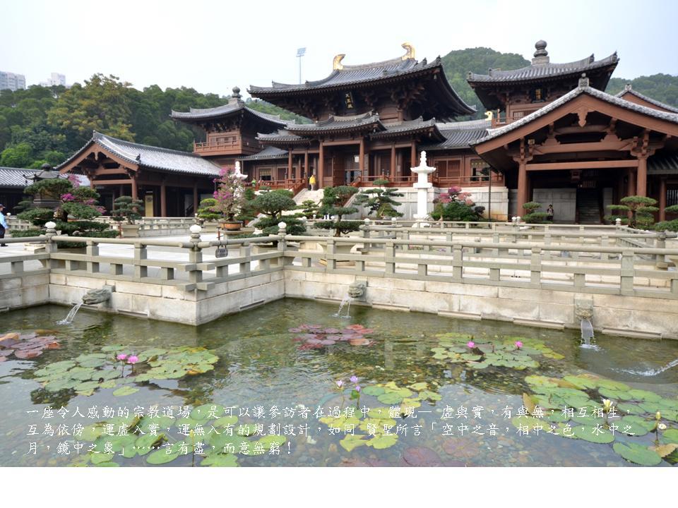 在香港櫛比鱗次的現代高樓建築環伺下,志蓮淨苑格外出落得寧静莊嚴,坐北朝南、倚山面海,寺院群依地勢而建,渾然天成。規畫理念源自於敦煌莫高窟「西方淨土經變圖」與「觀無量壽經變」,整體建築猶如淨土經變的立體化。