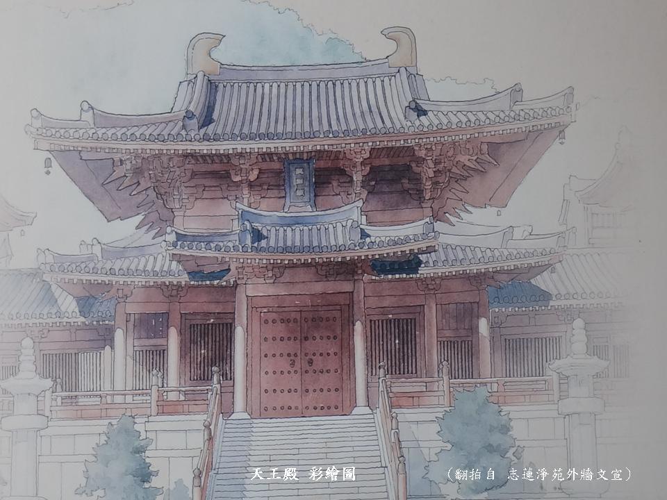 志蓮淨苑的殿堂是以中國唐代傳統木構建築為藍圖,採用天然建材,殿堂的木構件,均以榫接方式結合,不須使用釘子,比例和諧優美。殿堂供奉的佛菩薩像依據佛經描述,參照盛唐造像風格,厚重端麗,其造型、手印、執持法器各異,彰顯諸佛菩薩特有的願力和德行。整個殿堂南、東、西邊設三個大門,分別是「山門」、「東門」及「西門」。整體建築佈局為「三進三重門一院」。(雜誌資料來源:人生雜誌)