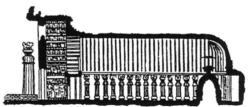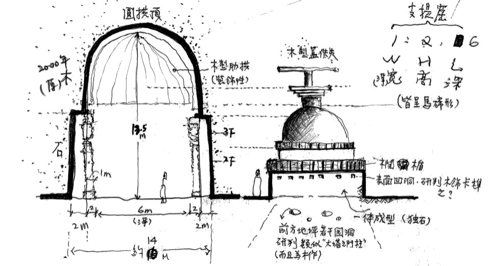 這樣的覆缽塔在早期的佛典《摩訶僧祇律》卷三十三中描述道:「爾時世尊自起迦葉佛塔,下基四方,周匝欄楯,圓起二重,方牙四出。上施盤蓋,長表輪相。」方牙指的即是四方伸出的小方台。