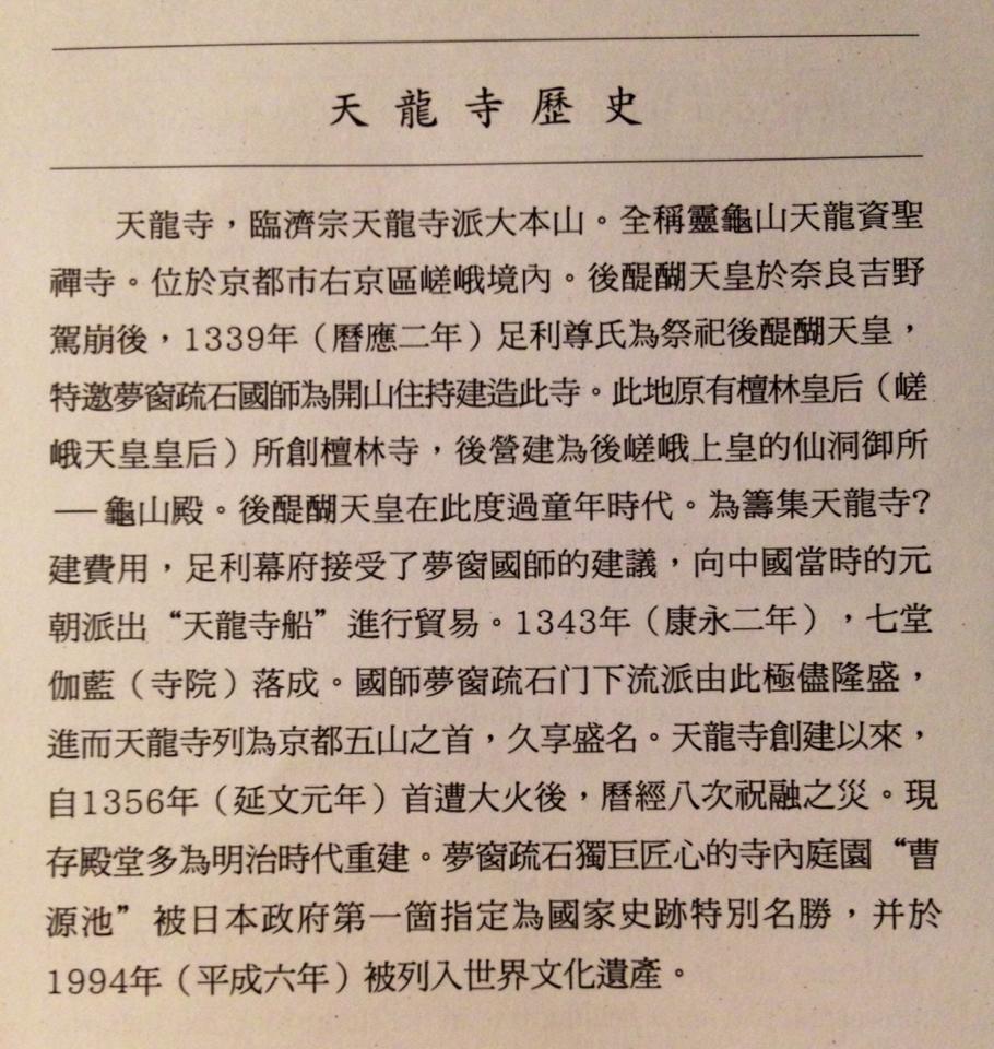 臨濟宗「天龍寺」,除了被日本列為特別名勝古蹟外,也在1994年12月時以「古都京都的文化財」的一部份而被聯合國教科文組織列入世界遺産名單之中。在京都五山中位居第一位,除了被日本列為特別名勝古蹟外,也在1994年12月時以「古都京都的文化財」的一部份而被聯合國教科文組織列入世界遺産名單之中。
