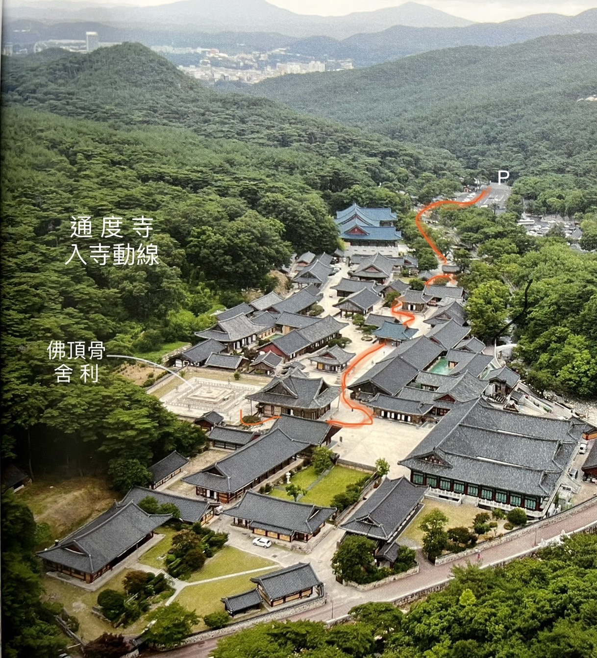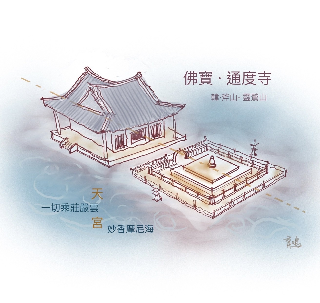通度寺,或稱靈鷲山通度寺,位於慶尚南道梁山市下北面的靈鷲山南麓。根據三國遺事記載,通度寺始建於新羅善德女王十五年(西元646年),為慈藏律師所創建。通度寺因寺院所在山脈狀似佛陀現身說法的印度靈鷲山,欲成為僧侶者皆需通過戒壇,通達萬法,濟度一切眾生,而得名為「通度寺」。文字來源:維基百科.