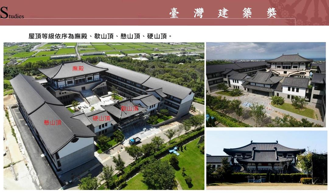 靜思堂屋頂呈傳統木造建築中的單簷歇山式頂,但正脊筆直,垂脊、戧脊等,也都不作弧形燕尾起翹狀,是為北方建築系譜。但不同於北方宮殿式,屋頂不覆瓦,沒有金黃色的琉璃瓦,沒有斗拱雀替,沒有大紅柱,用色樸素。雖有日系佛寺的韻味,但屋脊兩端無鬼瓦,歇山面亦無木刻懸魚,整體結構線條俐落,外觀簡單自然。(資料來源:台灣大學陳清香 )。 圖片來源:順鼎營造。