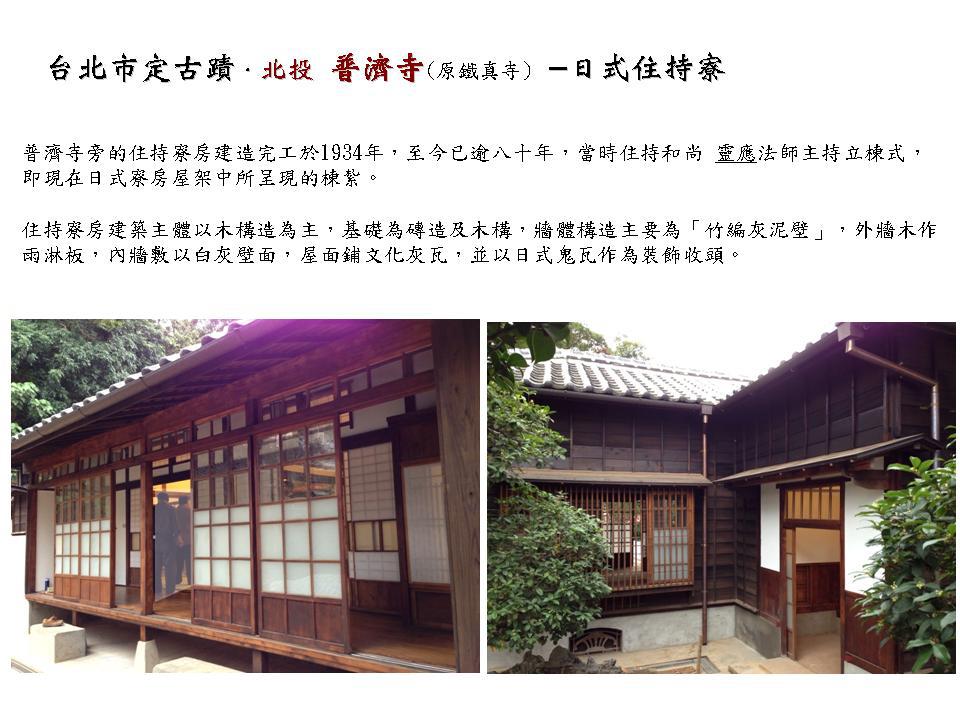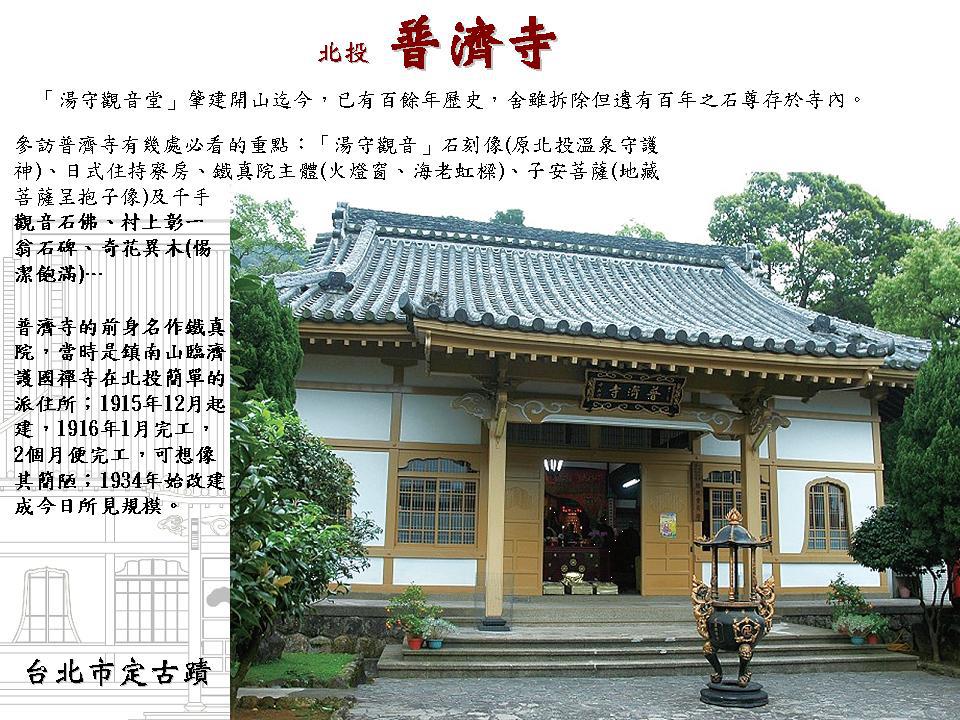 台北市定古蹟 北投普濟寺創建於1905年,原名「鐵真院」,是台灣罕見的日本真言宗佛寺,主祀湯守觀音。寺院建築為日式風格,平面佈局保存極為完整,並呈現出簡樸淡雅且寧靜莊嚴的氛圍。佛寺採用日式風格,平面佈局保存極為完整,包括大殿及住持方丈宅院,皆呈現簡樸淡雅且寧靜莊嚴之佛教寺院之美。文字來源:文化部