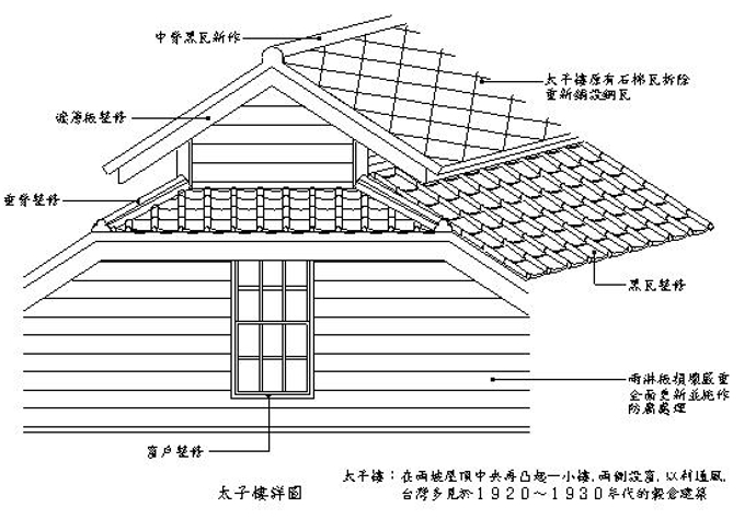 構架部分(軸組)採木造柱結構系統,斜屋頂屋架及局部加蓋之鐵皮屋頂。基礎地下室為鋼筋混凝土構造,其中地下室可直通後院。包括垂直的承重柱、柱上橫梁、木地檻、門楣、門檻等橫架材。